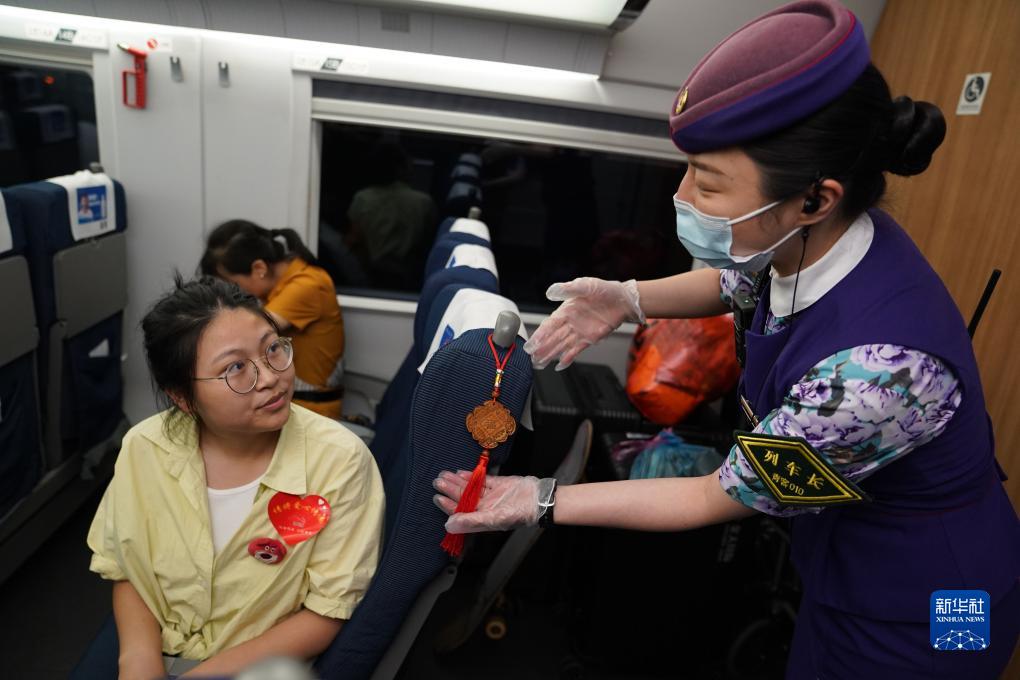 在列車(chē)上,列車(chē)長(cháng)專(zhuān)門(mén)在蔣張子怡的座椅上掛上代表重點(diǎn)旅客的標識(8月31日攝)。
