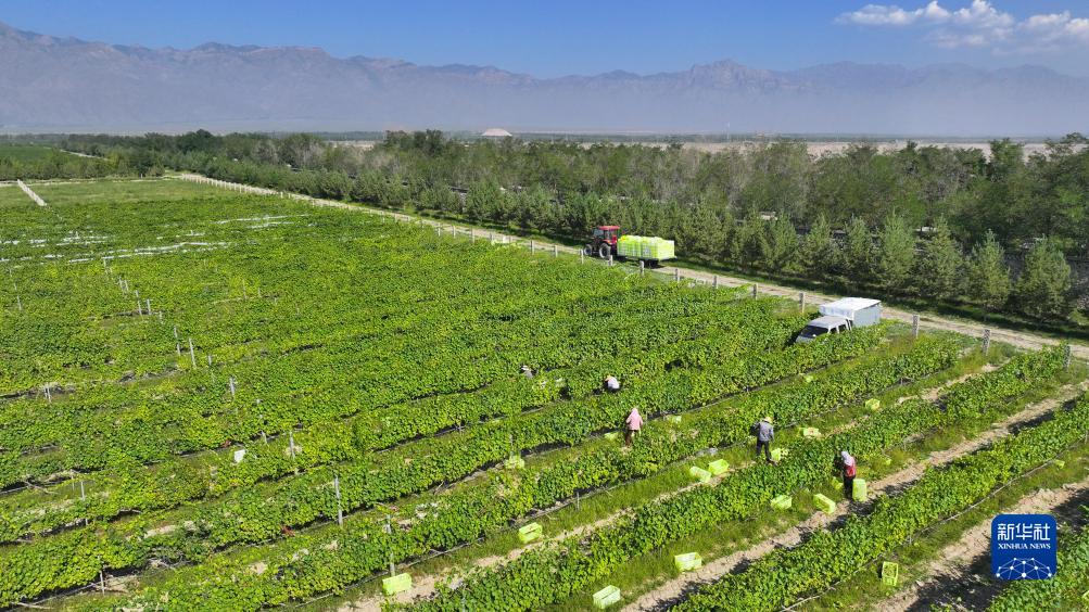 采摘工在位于賀蘭山東麓銀川市西夏區的志輝源石酒莊采摘釀酒葡萄(無(wú)人機照片,9月1日攝)。