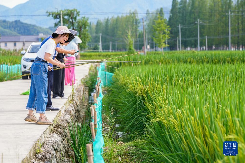 9月2日,游客在太陽(yáng)鎮綜合種養水稻田里體驗釣稻蛙的樂(lè )趣。