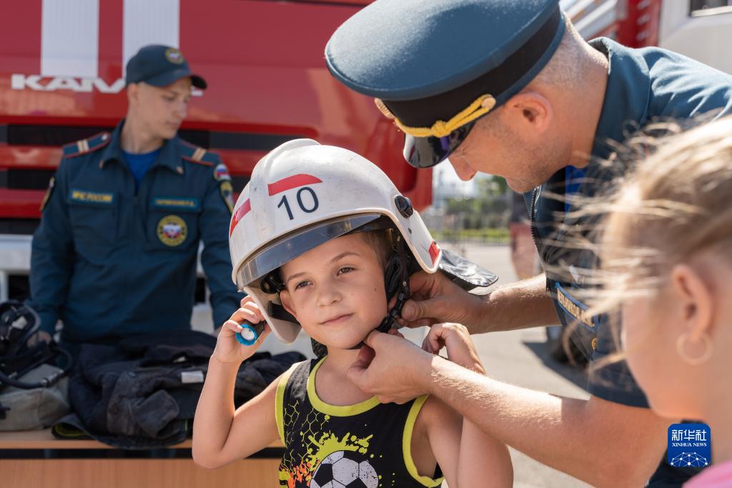 9月2日,在俄羅斯符拉迪沃斯托克舉辦的“知識日”活動(dòng)上,一名兒童試戴消防頭盔。