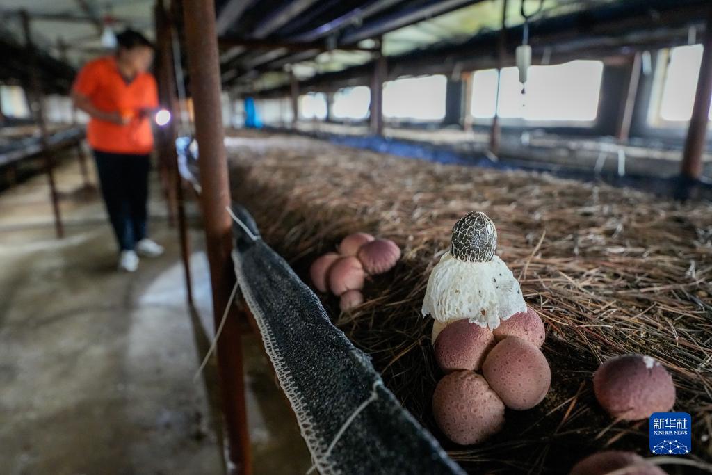 9月2日,農民在河北省遷西縣三屯營(yíng)鎮六寶峪村食用菌種植基地查看竹蓀長(cháng)勢。