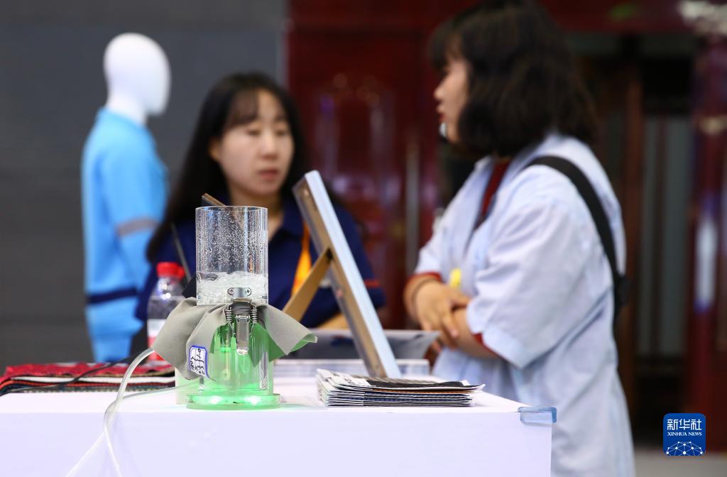 9月2日,在國家體育館舉行的服貿會(huì )環(huán)境服務(wù)專(zhuān)題展上,觀(guān)眾在中科海勢展臺展出的拓撲柔凝膠材料旁交流。