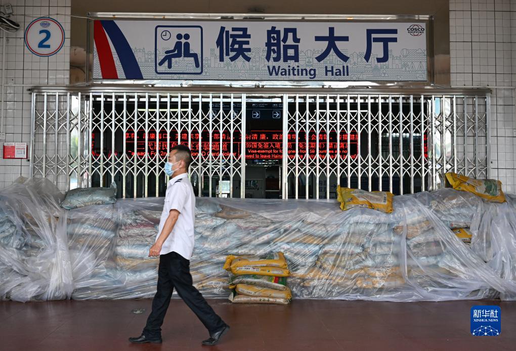 9月2日下午,海南省??谑行阌⒏酆虼髲d關(guān)閉,大廳門(mén)外已布設了防汛沙袋。