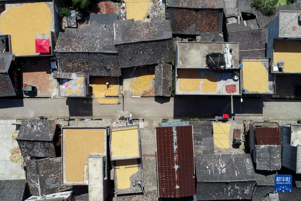 9月2日,村民在貴州省黔東南苗族侗族自治州丹寨縣龍泉鎮得祿村晾曬農作物(無(wú)人機照片)。