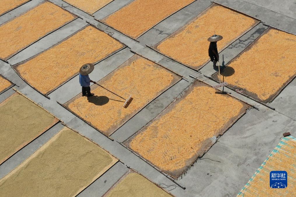9月2日,貴州省黔東南苗族侗族自治州岑鞏縣注溪鎮衙院村村民在晾曬農作物(無(wú)人機照片)。