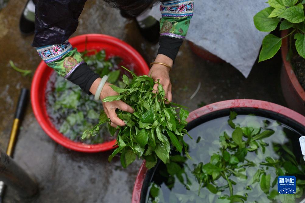 烏英苗寨婦女梁足英在用山泉水浸泡剛剛收割回來(lái)的藍靛草(2023年8月29日攝)。新華社記者 黃孝邦 攝