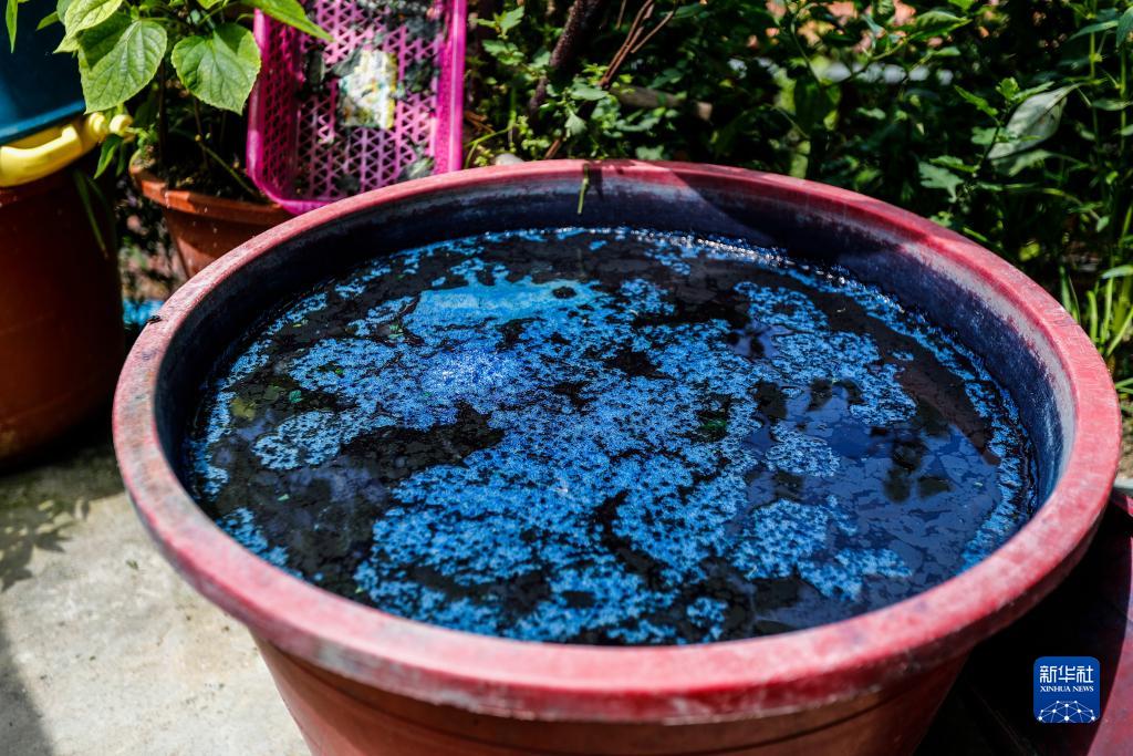 這是烏英苗寨婦女梁足英用山泉水浸泡藍靛草三天后,藥水呈現的顏色(2023年8月31日攝)。新華社記者 胡星宇 攝