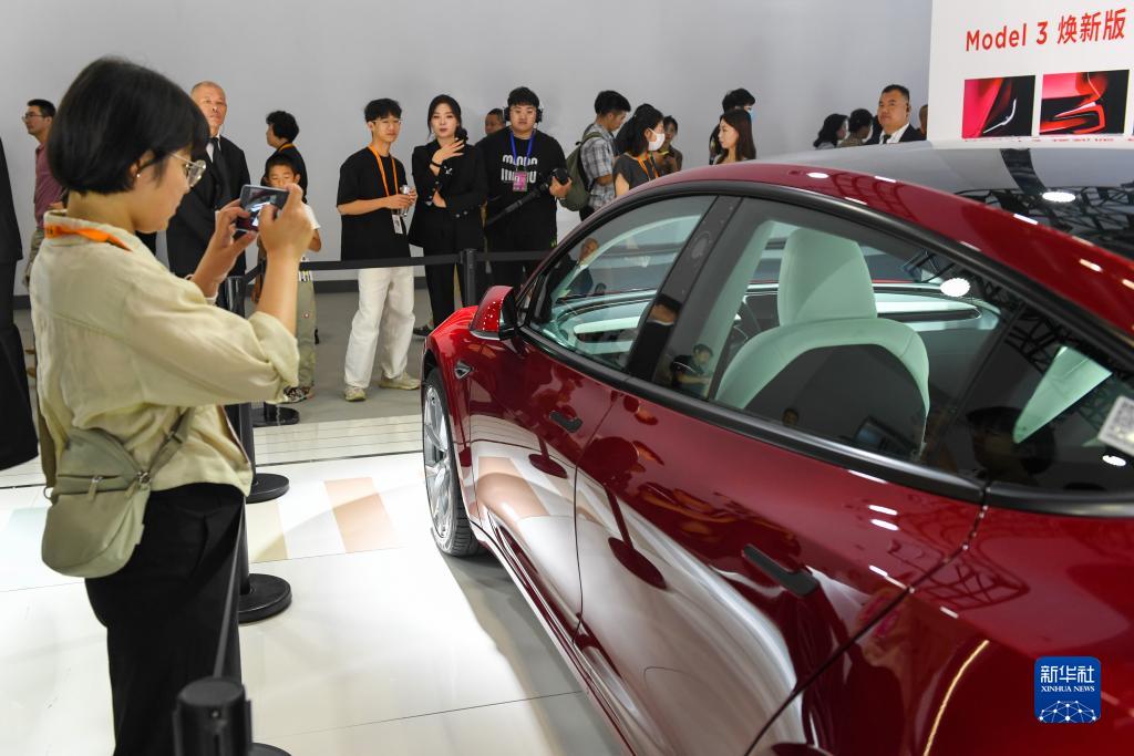 9月3日,在國家會(huì )議中心的特斯拉公司展臺,參觀(guān)者在了解特斯拉展出的新款電動(dòng)車(chē)。