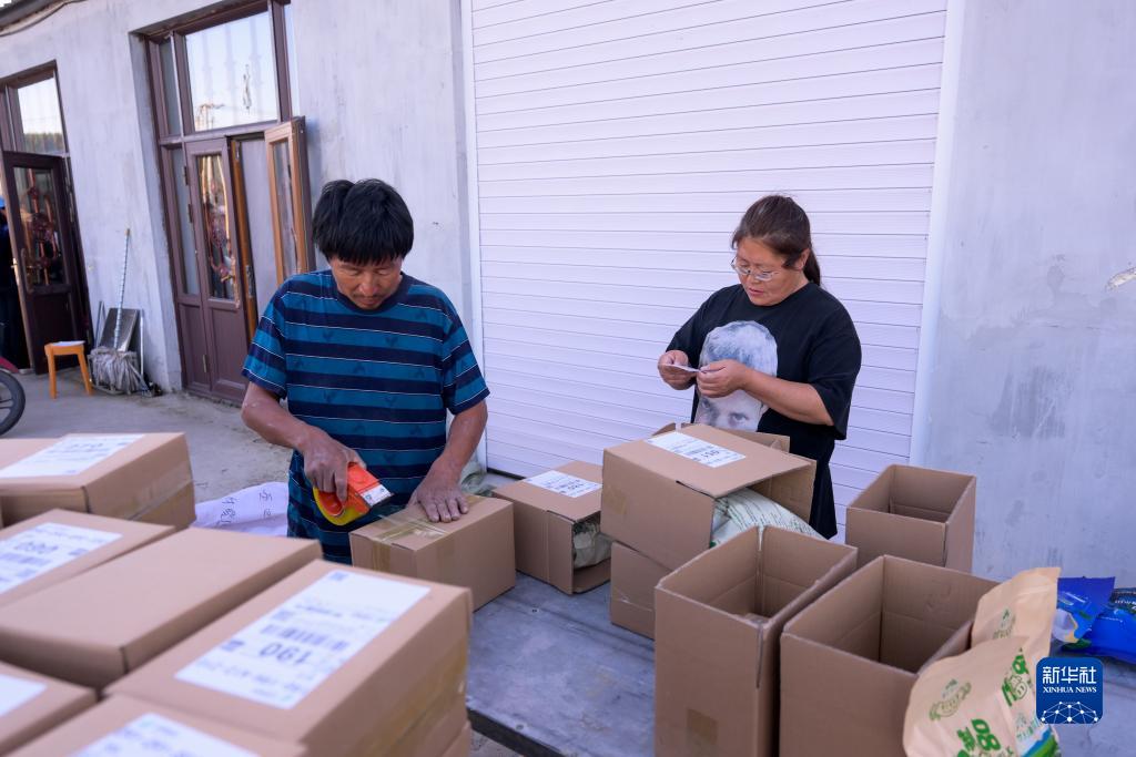 9月2日,阿爾山市西口村村民將當地特產(chǎn)打包,準備發(fā)快遞。