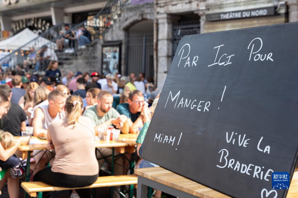 9月3日,人們在法國里爾舊貨市場(chǎng)上品嘗貽貝,餐館的告示牌寫(xiě)著(zhù)“來(lái)這里用餐吧!”等字樣招徠顧客。
