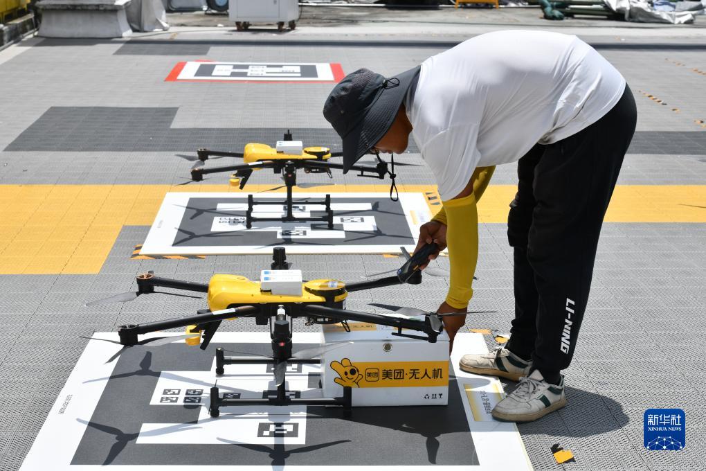 在深圳市龍崗區一處無(wú)人機起飛場(chǎng),工作人員準備掛載餐箱(8月15日攝)。