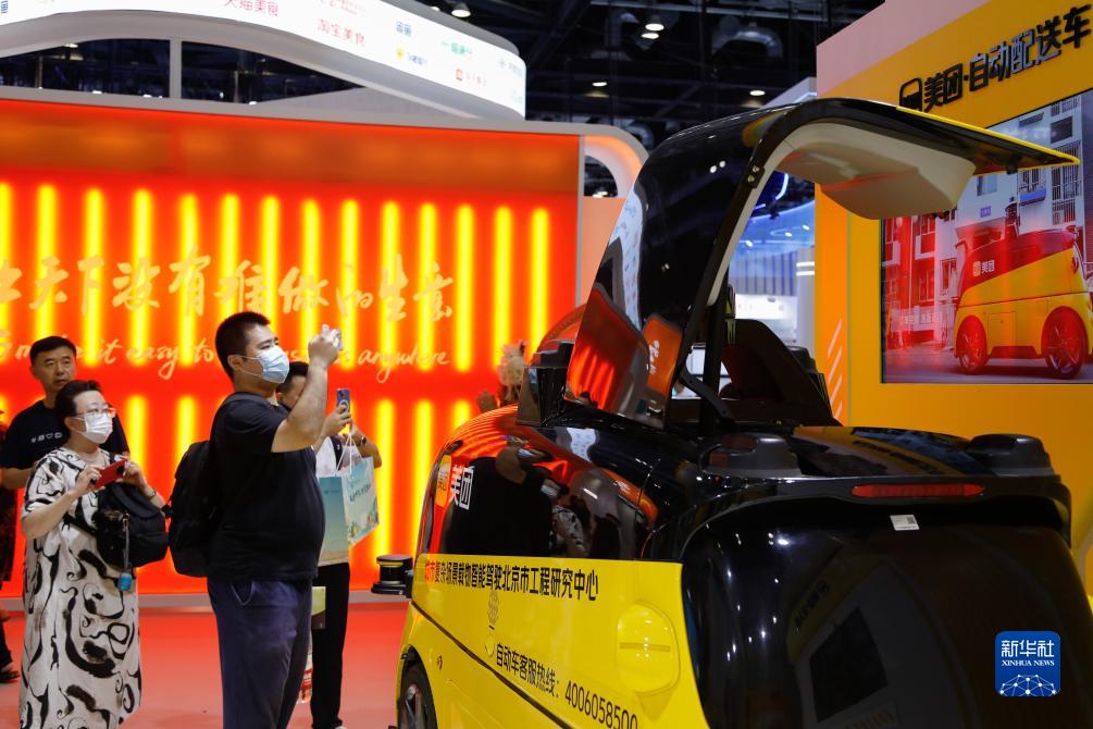 9月4日,在2023年服貿會(huì )國家會(huì )議中心美團展臺,觀(guān)眾參觀(guān)一款自動(dòng)配送車(chē)。