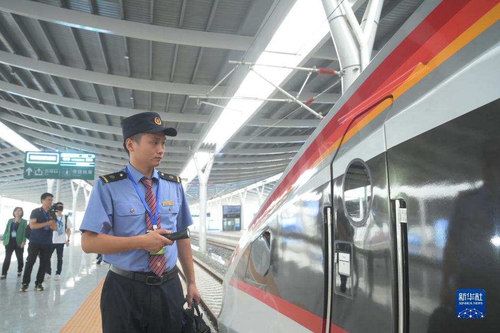 9月4日,G55401次復興號智能動(dòng)車(chē)組隨車(chē)機械師代帥帥在進(jìn)行車(chē)輛出發(fā)前的檢查工作。