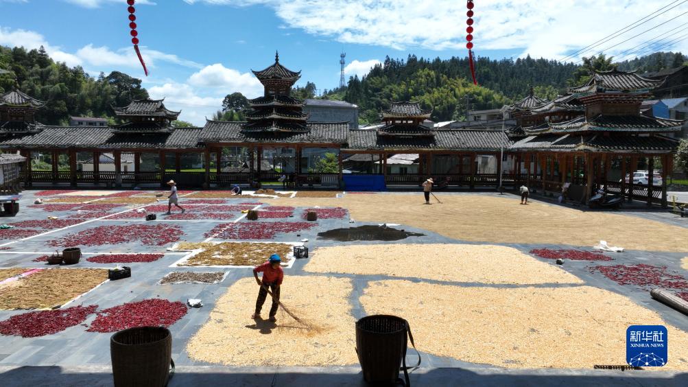 9月4日,村民在貴州省黔東南苗族侗族自治州錦屏縣大同鄉秀洞村廣場(chǎng)晾曬農作物(無(wú)人機照片)。