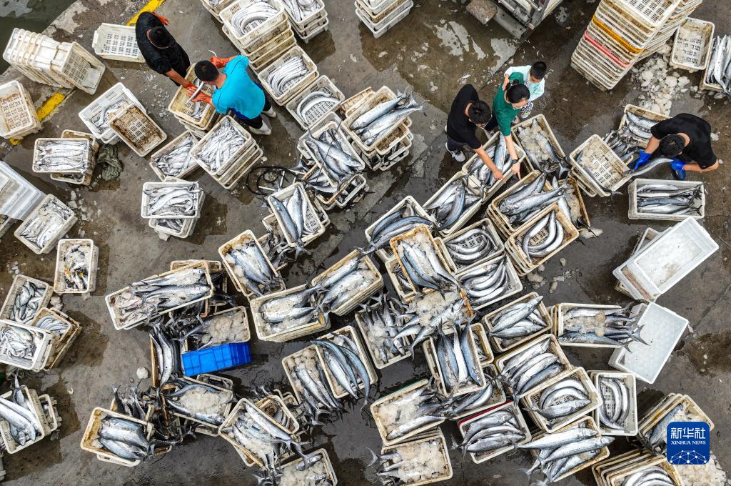 9月4日,市民在榮成市成山鎮落鳳漁港選購新鮮的鲅魚(yú)(無(wú)人機照片)。