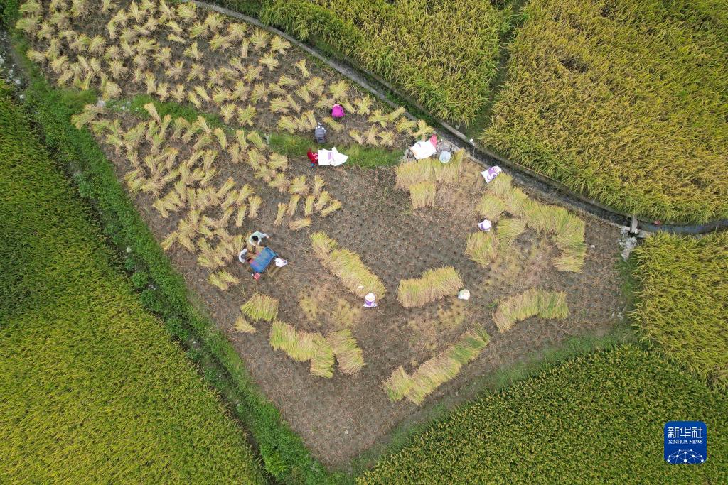 9月4日,村民在貴州省黔東南苗族侗族自治州黃平縣舊州鎮草蘆坪村收割水稻(無(wú)人機照片)。