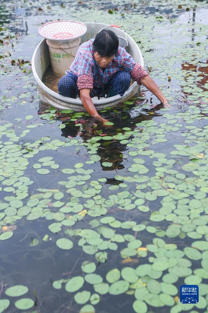 9月5日,在建德市航頭鎮烏龍村莼菜基地,村民劃著(zhù)“盆船”在西湖莼菜產(chǎn)業(yè)園種植基地采摘西湖莼菜。