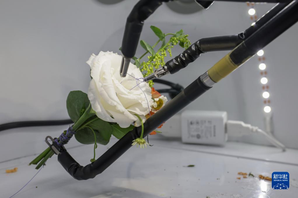 9月4日,在服貿會(huì )首鋼園區北京友誼醫院展臺,圖邁單臂腔鏡手術(shù)機器人用手術(shù)線(xiàn)打結。