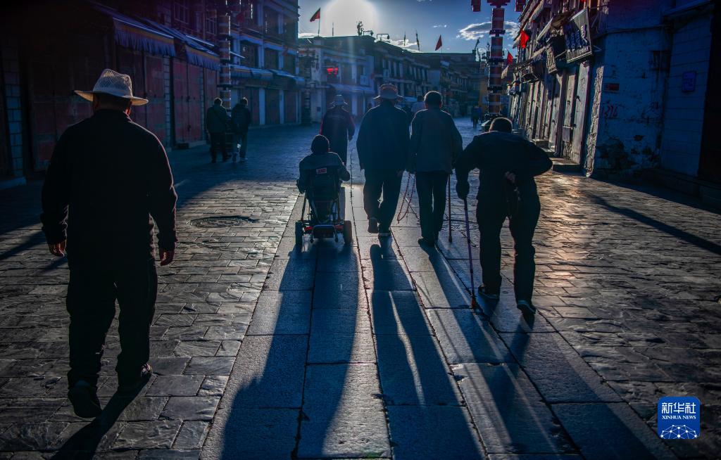 拉巴頓珠(騎電動(dòng)輪椅車(chē)者)在清晨的八廓街(9月3日攝)。