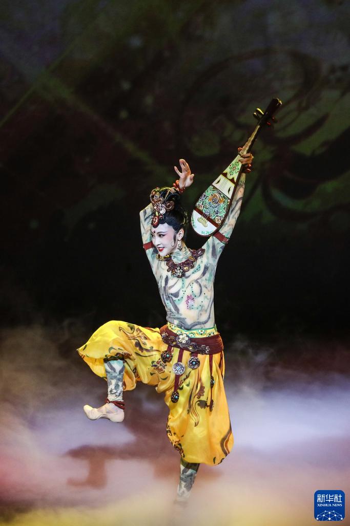 9月5日晚,在甘肅省敦煌市的敦煌大劇院,青年舞蹈家殷碩在音樂(lè )劇《飛天》(音樂(lè )會(huì ))上表演節目《飛天彩虹》。