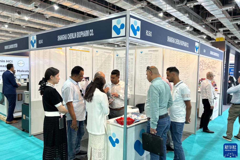 9月3日,在埃及開(kāi)羅舉辦的2023埃及醫藥展上,參觀(guān)者在一家中國醫藥企業(yè)的展位上了解信息。