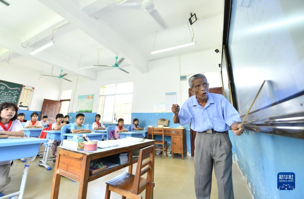 在梧州市長(cháng)洲區長(cháng)洲鎮泗洲小學(xué),陳明仲在教孩子們唱下俚歌(9月5日攝)。