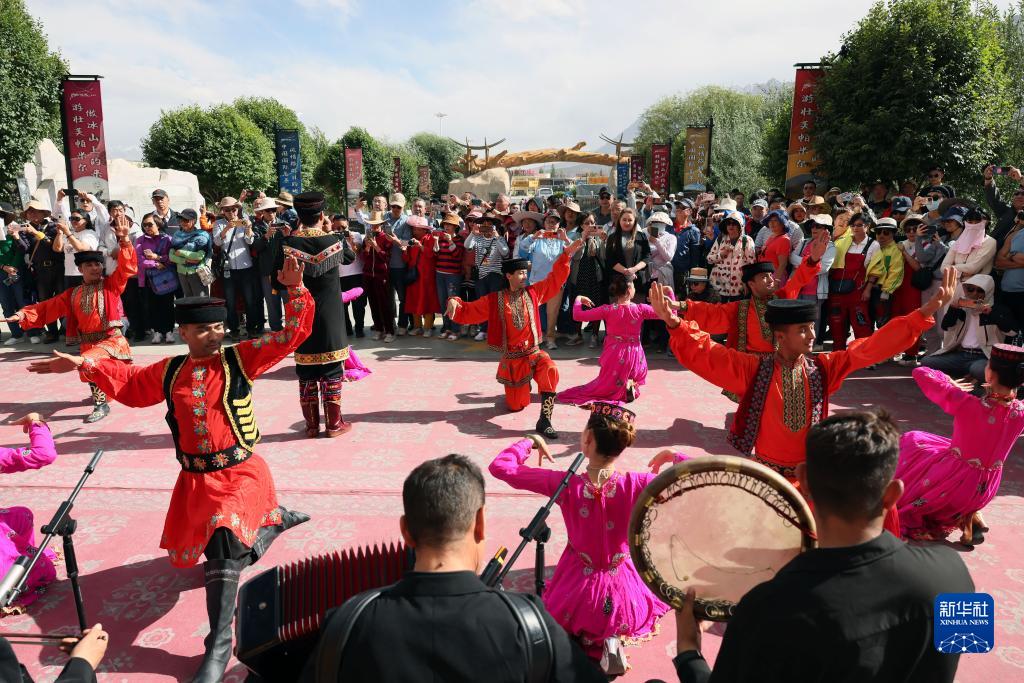在新疆塔什庫爾干塔吉克自治縣帕米爾旅游區游客服務(wù)中心,縣文工團演員唱歌跳舞歡迎游客(9月4日攝)。