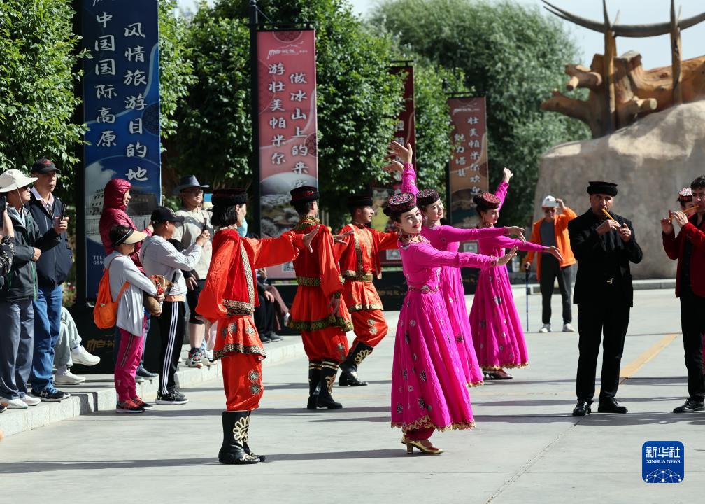 在新疆塔什庫爾干塔吉克自治縣帕米爾旅游區游客服務(wù)中心,縣文工團演員跳舞歡迎游客(9月4日攝)。