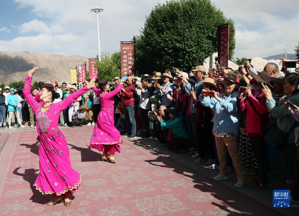 在新疆塔什庫爾干塔吉克自治縣帕米爾旅游區游客服務(wù)中心,縣文工團演員跳舞歡迎游客(9月4日攝)。