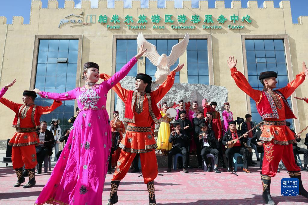 在新疆塔什庫爾干塔吉克自治縣帕米爾旅游區游客服務(wù)中心,縣文工團演員跳舞歡迎游客(9月4日攝)。