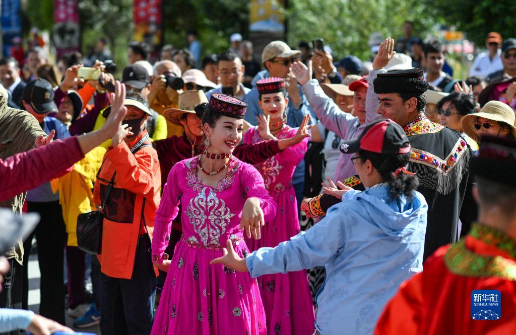 在新疆塔什庫爾干塔吉克自治縣帕米爾旅游區游客服務(wù)中心,縣文工團演員與游客共舞(9月4日攝)。