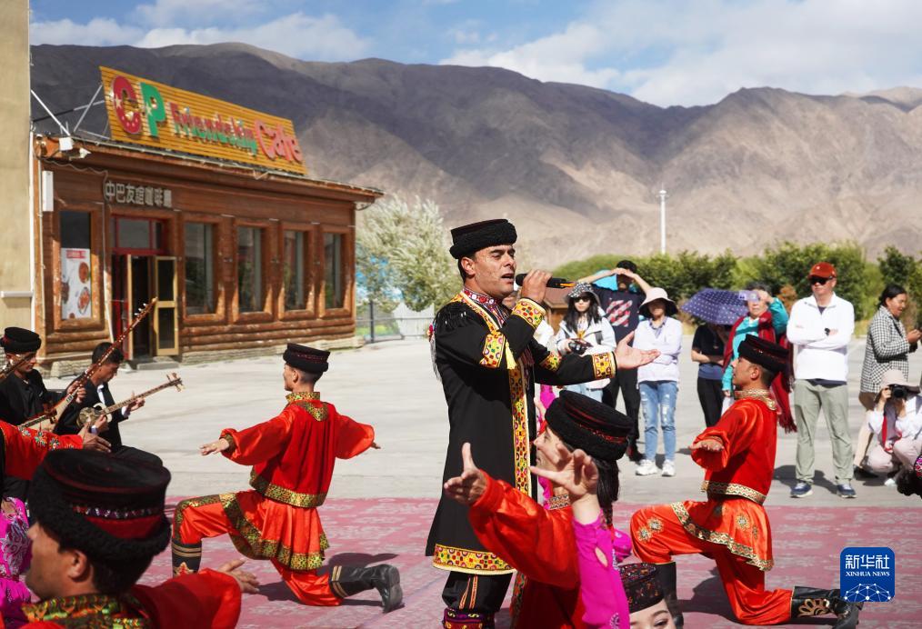 在新疆塔什庫爾干塔吉克自治縣帕米爾旅游區游客服務(wù)中心,縣文工團演員唱歌跳舞歡迎游客(9月4日攝)。
