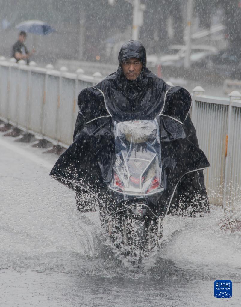 9月6日,市民冒雨騎行在福州市晉安區福新路上。