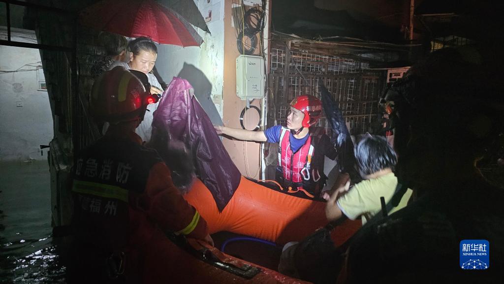 9月6日,在福州市臺江區斗池路鳳凰新村,消防救援人員利用橡皮艇轉移被困群眾。