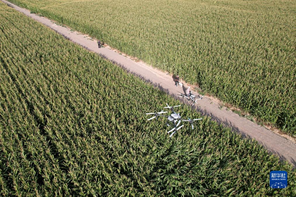9月5日,在山丹縣位奇鎮十里堡村,技術(shù)人員開(kāi)展“一噴多促”作業(yè)(無(wú)人機照片)。