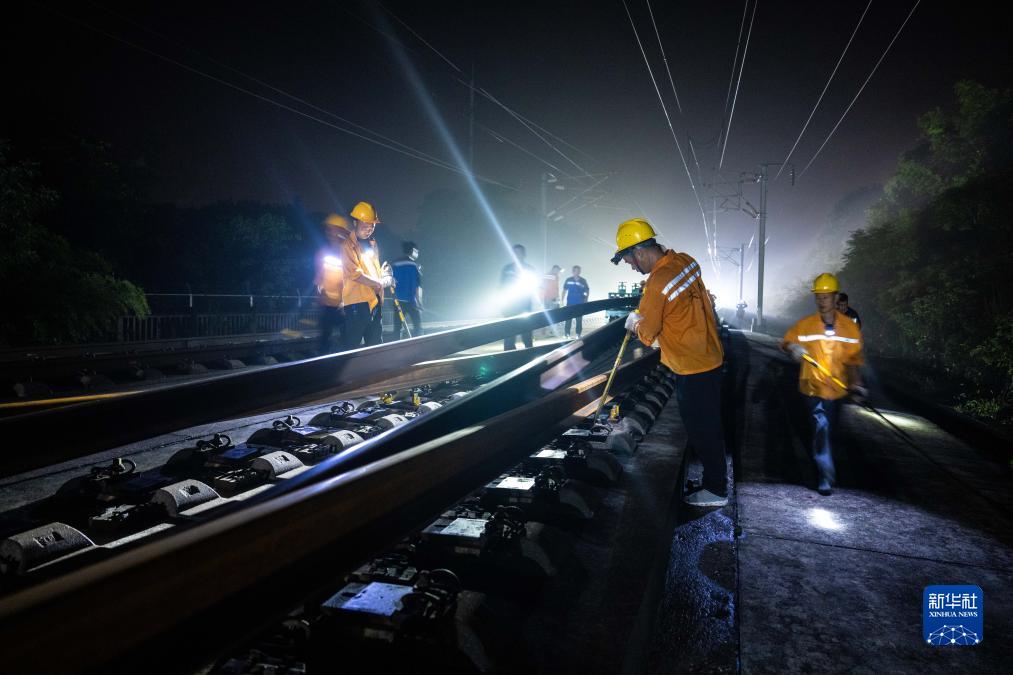 9月6日凌晨,鐵路工人在京廣高鐵株洲西至衡山西區間進(jìn)行換軌施工。