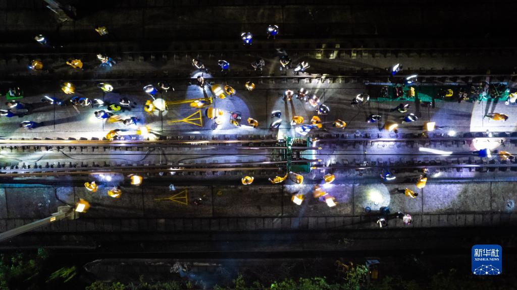 9月6日凌晨,鐵路工人在京廣高鐵株洲西至衡山西區間進(jìn)行換軌施工(無(wú)人機照片)。