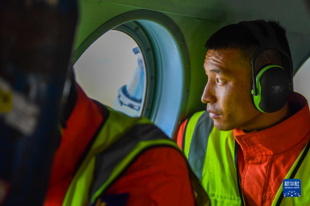 新疆伊犁哈薩克自治州森林消防支隊指戰員郭凱睿在直升機上觀(guān)察窗外情況(9月5日攝)。