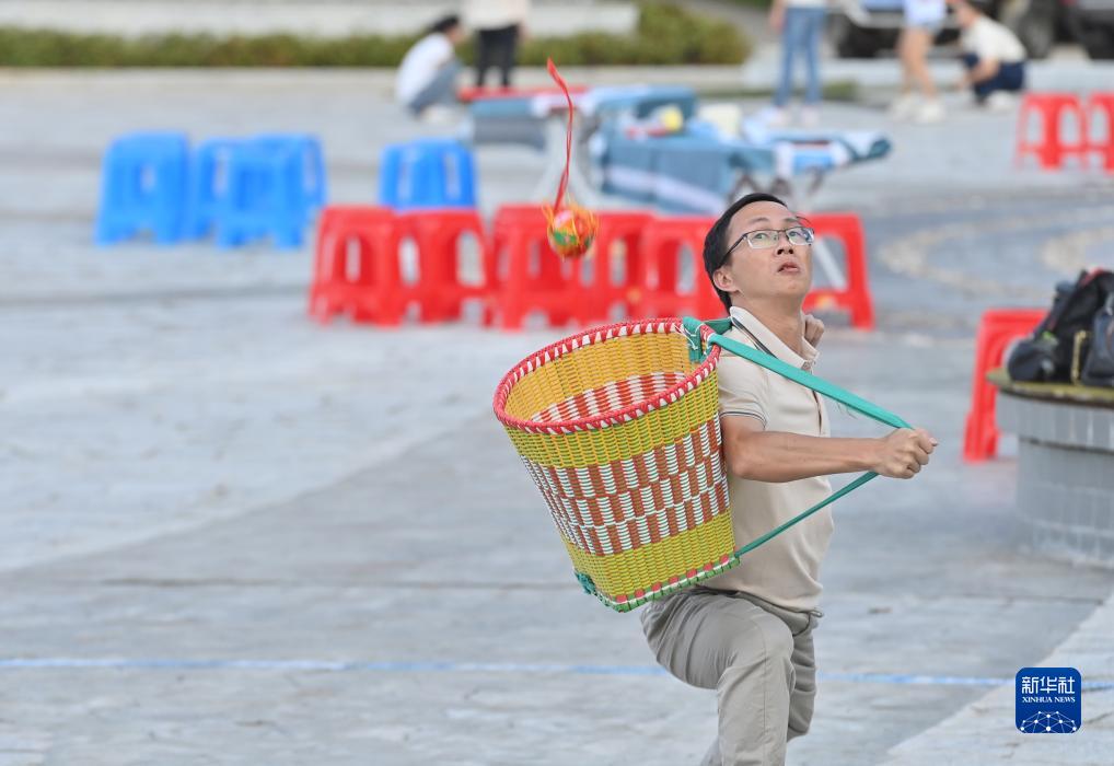 9月5日,在梧州市蒼梧縣六堡鎮山坪村同心廣場(chǎng),選手在拋繡球比賽中。
