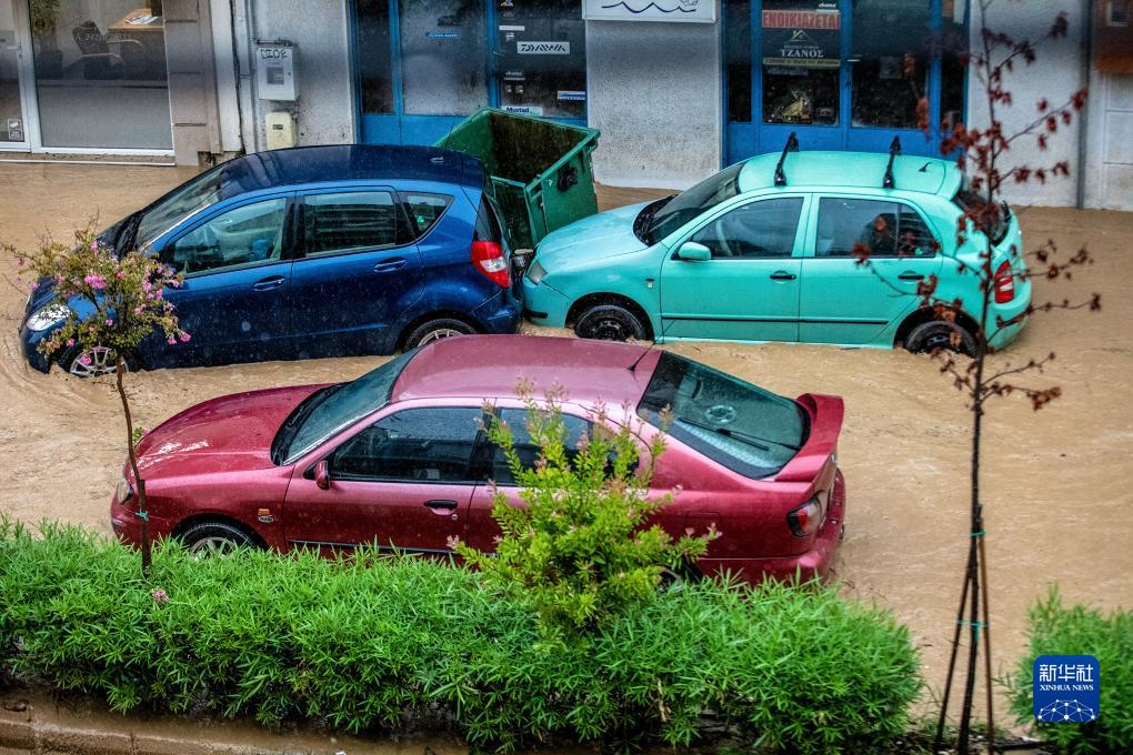 9月5日,在希臘中部城市沃洛斯,車(chē)輛被積水包圍。