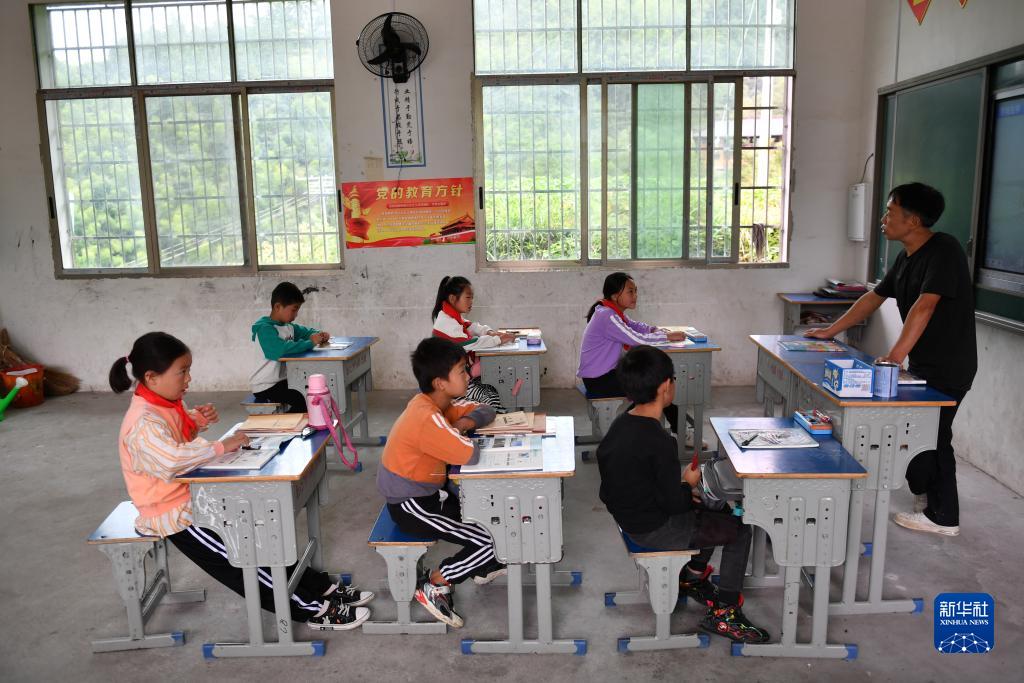 學(xué)校的主心骨是1985年就來(lái)這里任教的校長(cháng)段同山,曾經(jīng)最困難的時(shí)候只有他一個(gè)老師和十幾個(gè)學(xué)生。如今曾在報木小學(xué)就讀、大學(xué)畢業(yè)后回來(lái)任教的劉鳳英,和今年剛從師范學(xué)校畢業(yè)的“00后”羅瀟一起采用復式教學(xué)的形式,為45個(gè)學(xué)生開(kāi)展日常教學(xué)、文娛活動(dòng)等。