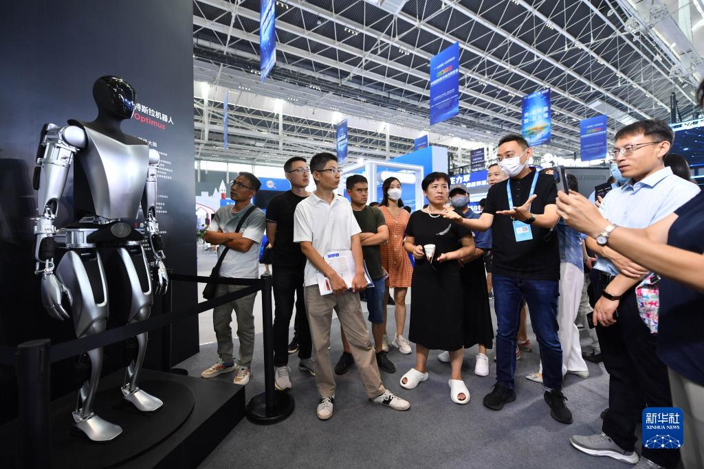 9月6日,在2023中國國際數字經(jīng)濟博覽會(huì )上,工作人員向參觀(guān)者介紹特斯拉機器人。
