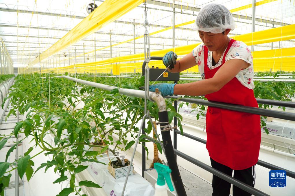 9月6日,在山東省昌邑市飲馬鎮,蔬菜種植戶(hù)在高標準種植大棚里培育西紅柿秧苗。