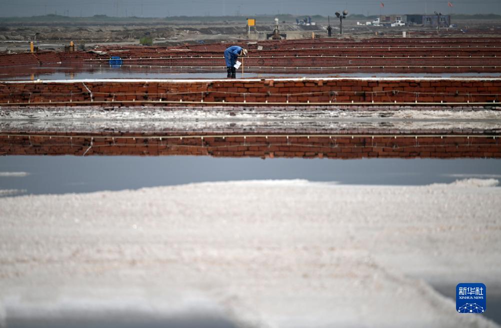 9月6日,在天津長(cháng)蘆漢沽鹽場(chǎng),工人在鹽池中測量鹵水深度。