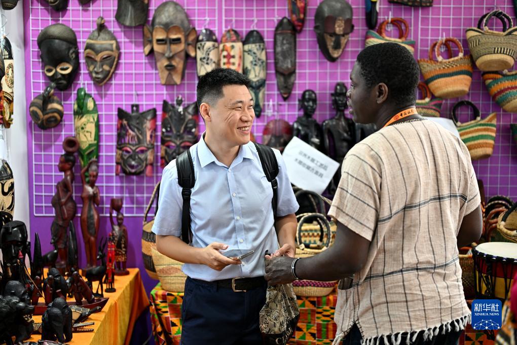 9月6日,一名參觀(guān)者在服貿會(huì )文旅服務(wù)專(zhuān)題展區烏干達展臺購買(mǎi)手工藝品。