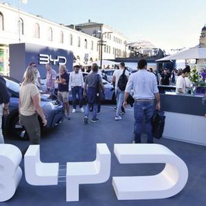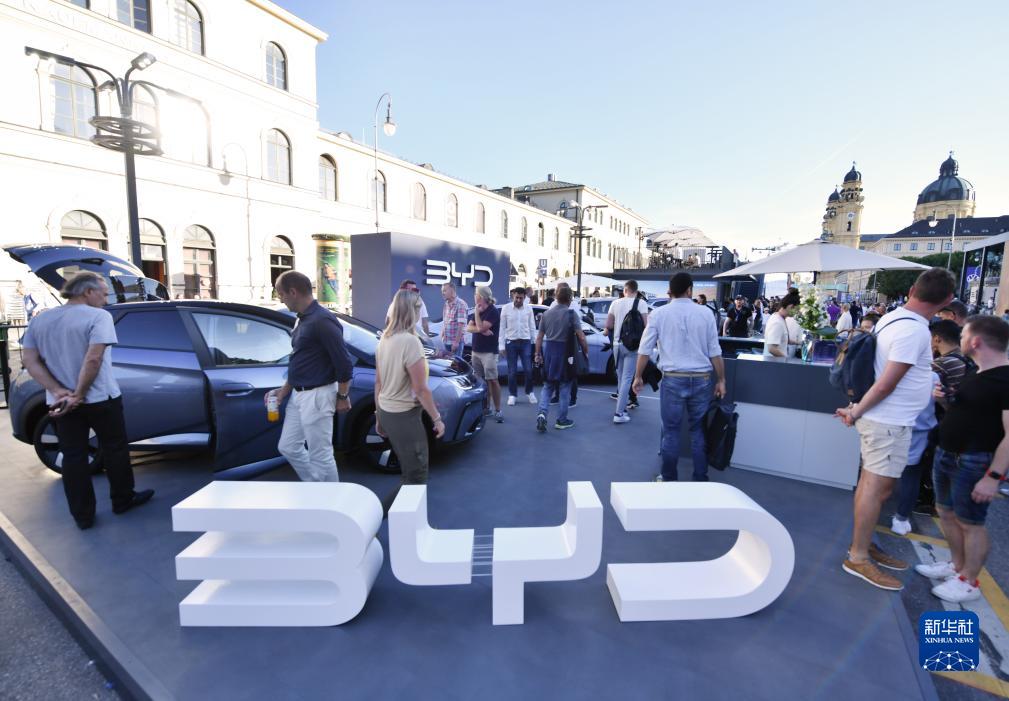9月5日,人們在德國慕尼黑國際車(chē)展的城市公共展示區參觀(guān)比亞迪汽車(chē)。