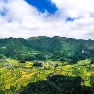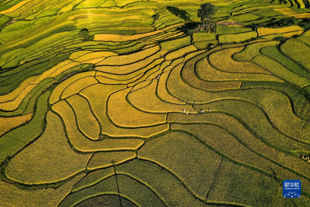 白露將至,貴州省黔南布依族苗族自治州貴定縣沿山鎮臘利梯田里的水稻逐漸成熟,呈現出一幅豐收在望的秋日畫(huà)卷。