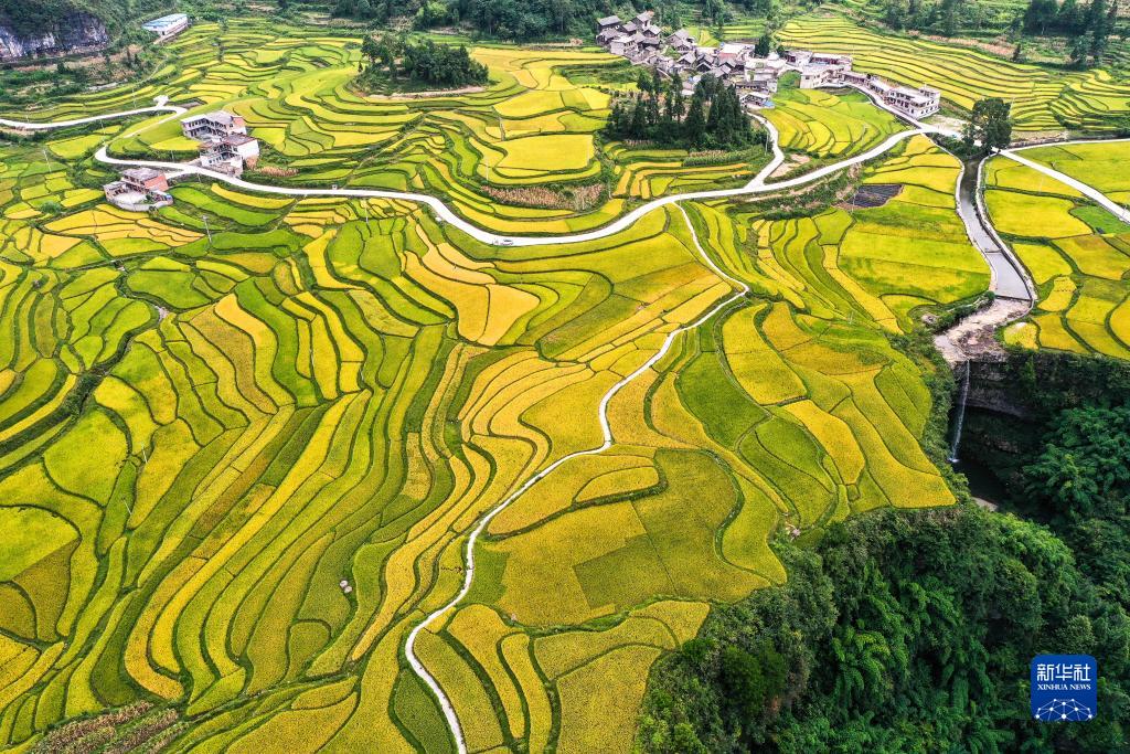 白露將至,貴州省黔南布依族苗族自治州貴定縣沿山鎮臘利梯田里的水稻逐漸成熟,呈現出一幅豐收在望的秋日畫(huà)卷。
