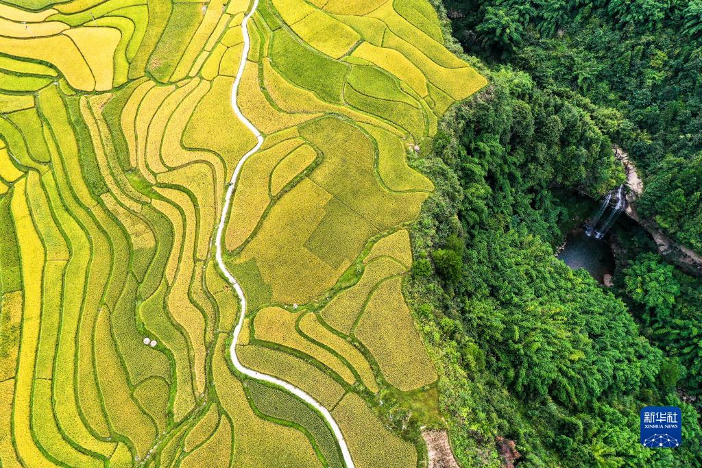 白露將至,貴州省黔南布依族苗族自治州貴定縣沿山鎮臘利梯田里的水稻逐漸成熟,呈現出一幅豐收在望的秋日畫(huà)卷。