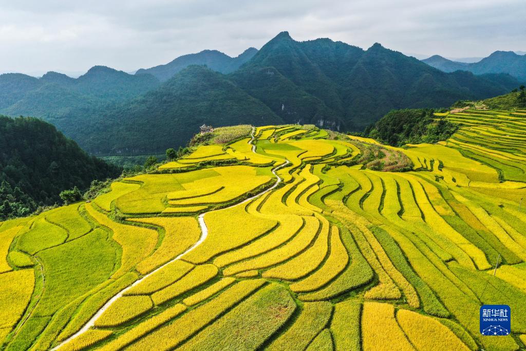 白露將至,貴州省黔南布依族苗族自治州貴定縣沿山鎮臘利梯田里的水稻逐漸成熟,呈現出一幅豐收在望的秋日畫(huà)卷。